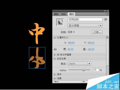 11、選擇圖層2中的元件,執(zhí)行修改-變形-垂直翻轉命令,并設置其alpha值為70,查看效果。