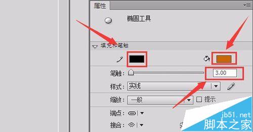 3、選擇橢圓工具,在右側的屬性里設置顏色為棕色,筆觸顏色為黑色,筆觸大小為3,如圖所示: