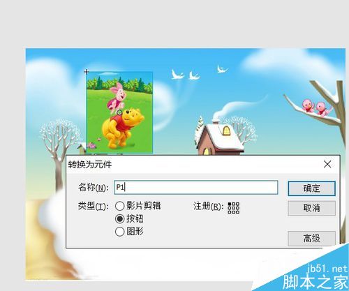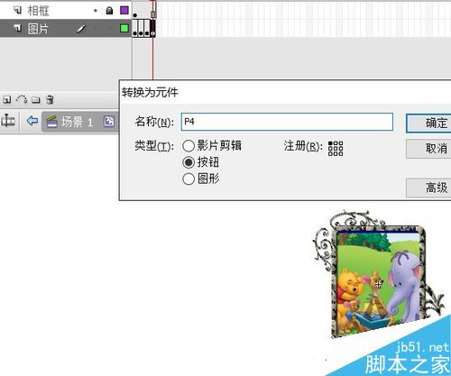 5、將后三幀中的圖片轉換為按鈕元件,分別命名為P2、3、4。