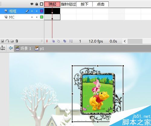 鼠標去探一探,一物漸漸浮出,原來是維尼的相框:小豬和維尼的友情圖片交換出現。點進去,原來還有維尼與各個伙伴的圖片。鼠標離開,相框又逐漸隱去。有意思嗎,做起來也不難,過程主要準備兩個MC:一個是若隱若現的MC;一個是點擊可以看圖片的MC。