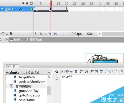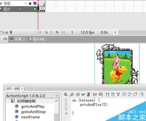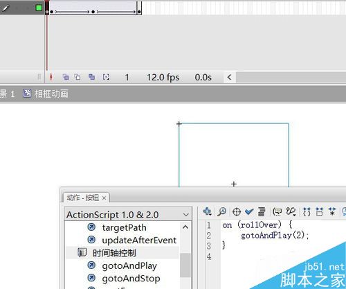 11、為幀2、11創建補間動畫,為幀1的按鈕寫上on (rollOver) {gotoAndPlay(2);},幀12的按鈕寫上on (rollOut) {gotoAndPlay(12);}