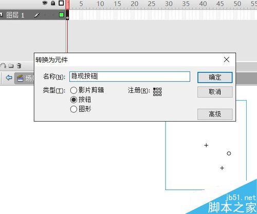 8、創建一個影片剪輯元件,第一幀拖入“隱現”MC,轉換為按鈕元件。居中對齊。