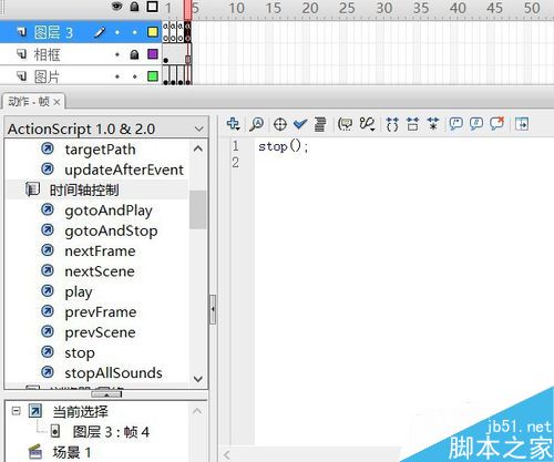 7、新建一層,插入四個關鍵幀,并在每幀上寫入stop();使MC不會自動播放。