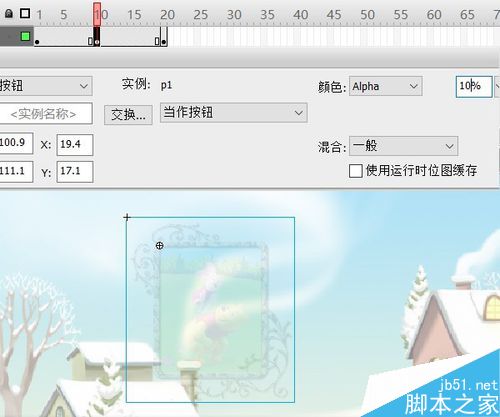 8、屬性面板中將幀1、20按鈕元件的透明度改為0%,幀10的按鈕透明度改為10%。