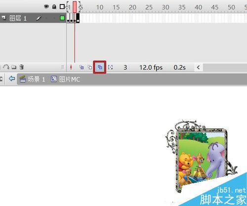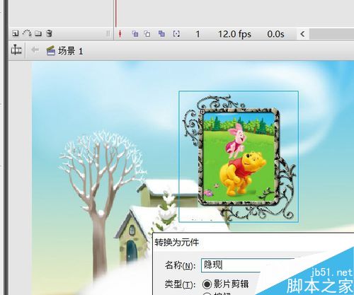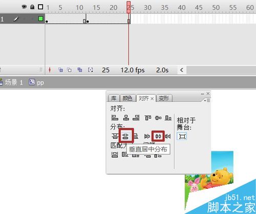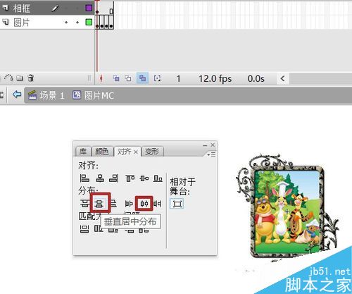 3、在幀1、12分別按下F6鍵插入關鍵幀。放入維尼與小豬的兩張圖片,對齊面板中選擇垂直居中分布、水平居中分布。24幀按下F5插入幀。