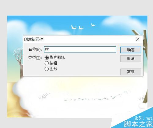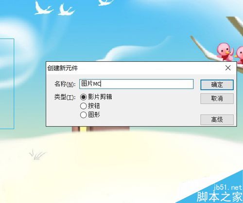 2、背景圖拖入層1。新建一層,Ctrl+F8創建新元件。類型:影片剪輯。