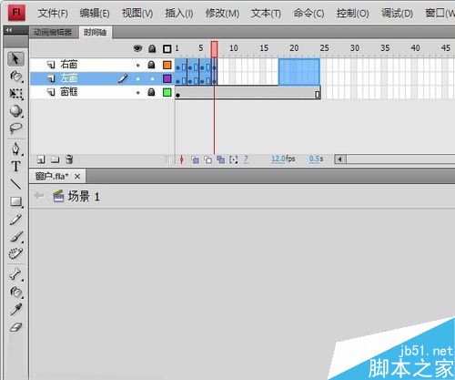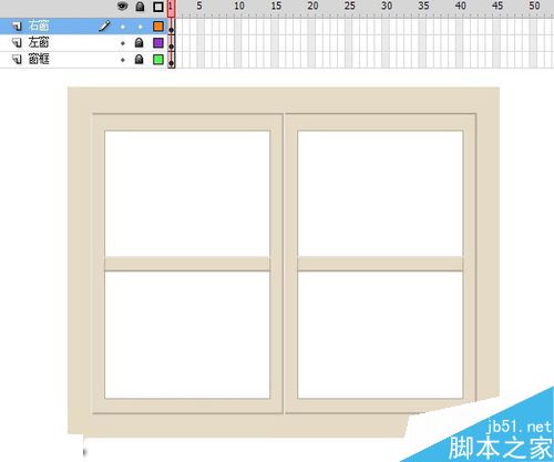 12、窗框?qū)拥?5幀F(xiàn)5插入幀。隨后,選中左右窗所有幀,按住Alt向右拖動至圖中位置。