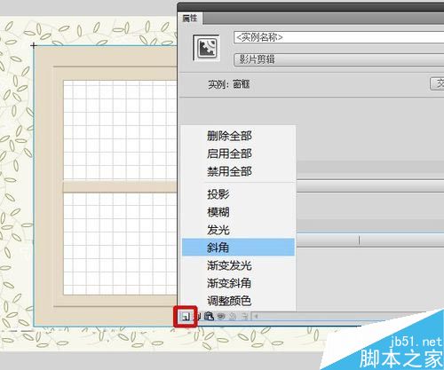 17、屬性面板滾動條拖至底部,打開濾鏡,為窗框添加斜角效果。強(qiáng)度50%。