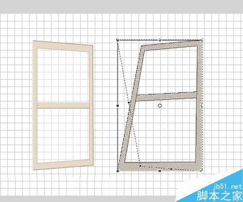 8、分別選取2、3層第三幀的窗戶(用選擇工具拖選,不易遺漏,但要注意將其他層鎖定),Q鍵調(diào)出變形工具,按住ctrl鍵(使變形框斜切)分別拖動上下邊角,將窗戶傾斜向內(nèi)縮小。如圖中右窗,左窗為調(diào)整后的形狀。這是向外打開的圖,如果窗位向內(nèi)打開,則邊角為斜向放大,如圖2。并且要考慮是否需要添加窗戶打開至墻壁的過程。