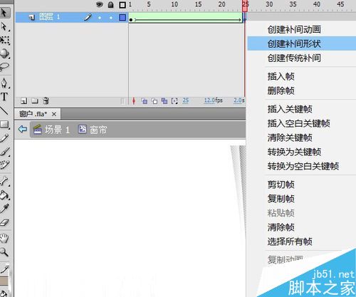 19、25、50幀分別添加關(guān)鍵幀,將25幀的圖形稍作調(diào)整。使窗簾向一邊飄動。為1幀和25幀創(chuàng)建補(bǔ)間形狀。