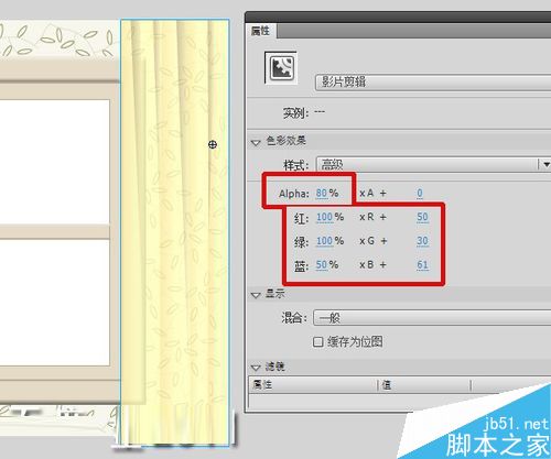 20、回到場景,庫中拖入窗簾,屬性面板中色彩效果選“高級”,參數(shù)設(shè)置如圖。