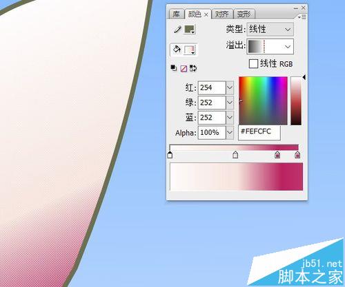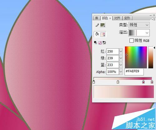 3、顏色面板中,選線性填充色,填充條設(shè)置如圖。色標(biāo)碼由左至右分別為#FEFCFC、#F7E3DC、#C02762、#C5376D。為左右兩側(cè)打開的花瓣填充上顏色。