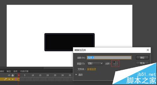 3、現(xiàn)在回到場景。從庫里面拖拽我們剛剛新建的元件到舞臺。可以看到,一個十字光標和一個空心圓點,對就是元件層級的注冊點和變形點。在這個層級上,依葫蘆畫瓢,可以選中元件后,設置元件相對于畫布左上角的位置。