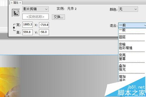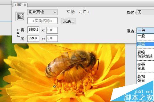 13、回到場景,屬性面板里,元件1的混合模式選為圖層。圖層混合模式會將此元件的圖層層疊顯示,即:該元件只有一個圖層顯示(另一個透明),第一幀是透明的(元件2的第一幀特性層疊到圖片圖層),最后一幀呈完全顯示(同理)。圖層的混合模式應用即完成。測試一下吧。