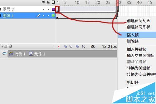 12、回到第一幀,右鍵——創建補間動畫。圖層一30幀右鍵——插入幀。完成元件1的編輯。