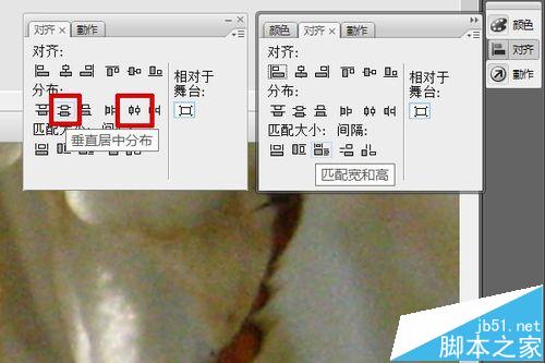 3、對齊面板中選擇匹配寬和高、垂直居中分布、水平居中分布。