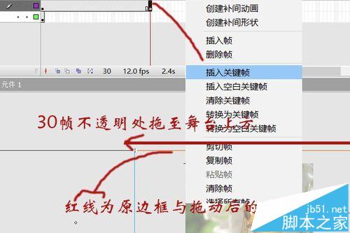 11、第30幀右鍵——插入關鍵幀。幀1將矩形透明處拖至舞臺上方,30幀不透明處拖至舞臺上方。