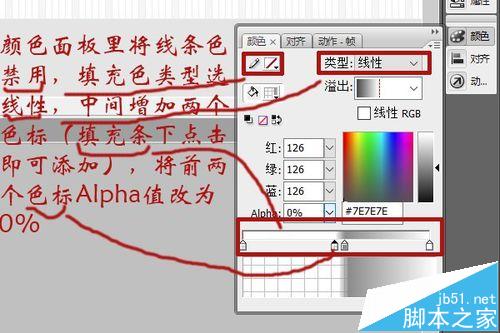 8、R鍵調出矩形工具,顏色面板里將線條色禁用,填充色類型選線性,中間增加兩個色標(填充條下點擊即可添加),將前兩個色標Alpha值改為0%