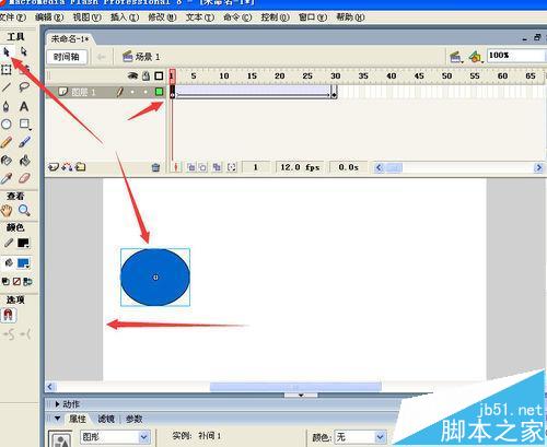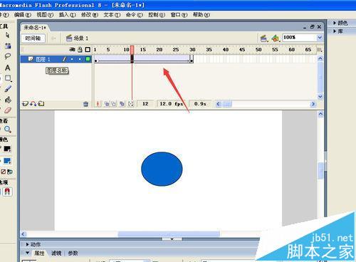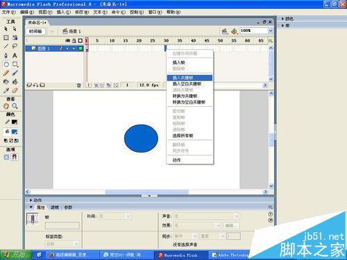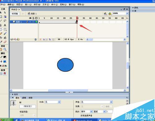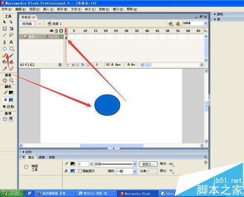 2、我們用畫圓工具在工作區畫一個圓。大小隨意。形狀不用是正圓,橢圓也可,你看到剛才 的空白關鍵幀的標記變成了實心。這個就是關鍵幀了。關鍵幀就是表示這一幀是形成動畫的關鍵動作。