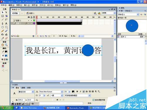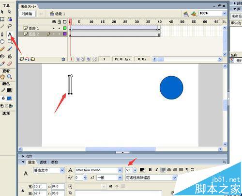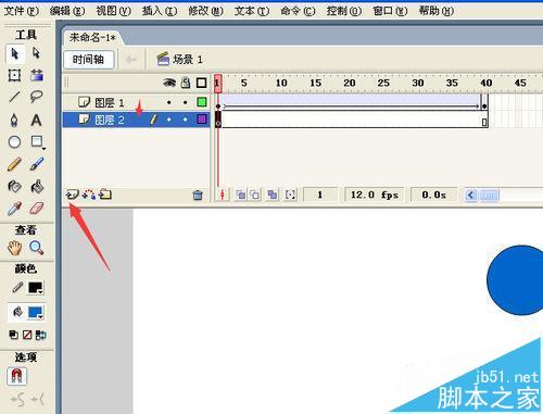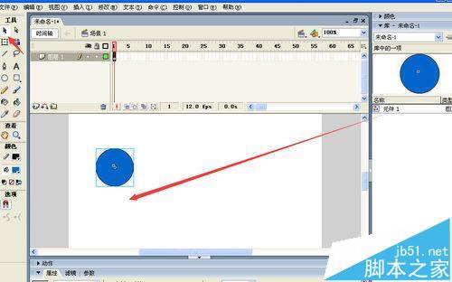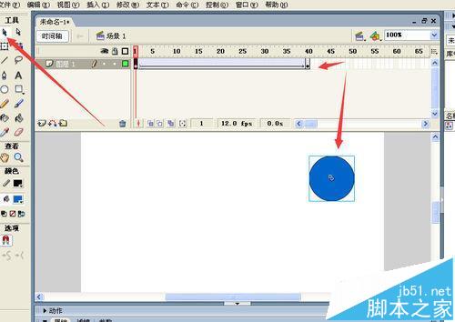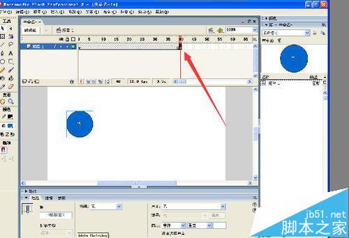 2、在后臺畫一個小球,回到場景,將小球從庫中拖動出來到左邊,在40幀處右鍵,建立關鍵幀。
