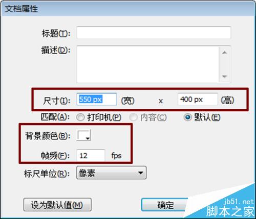 1、新建一個大小為550*400,幀頻為12fps,背景色為白色的文檔。