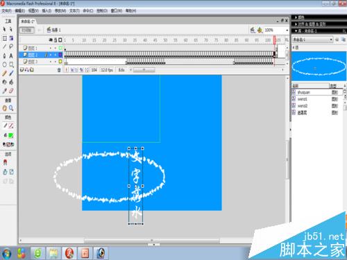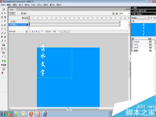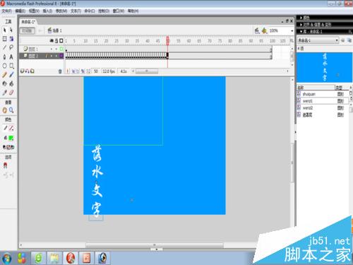 10、在第51幀處插入空白關鍵幀,將wenzi2圖形元件拖入到舞臺,按照第9步的方法制作逐幀動畫。