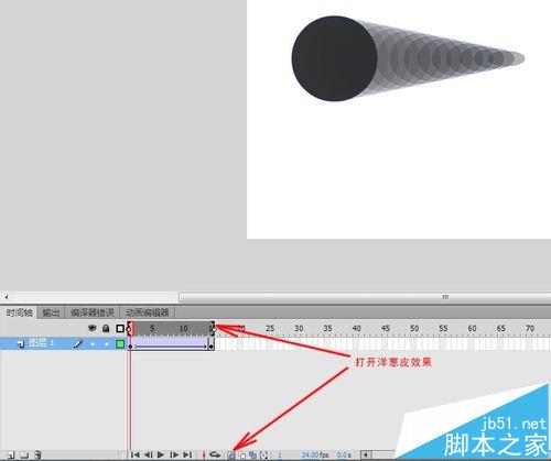 具體如圖:(注意打開洋蔥皮效果只是為了看到從第1幀到第15幀的過渡過程,觀察補間動畫如何形成,這里沒有實用意義)
