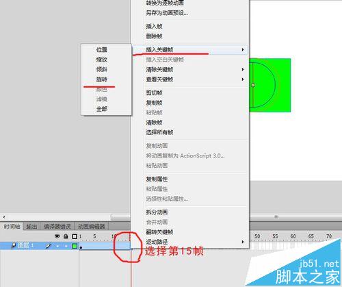 3)選擇第一幀點右鍵選擇第一項創建補間動畫,之后選擇第15幀(注意是只選擇第15幀而不是1-15幀)點右鍵-插入關鍵幀-旋轉。如圖一所示(可以做其它動畫我這里以旋轉動畫為例);