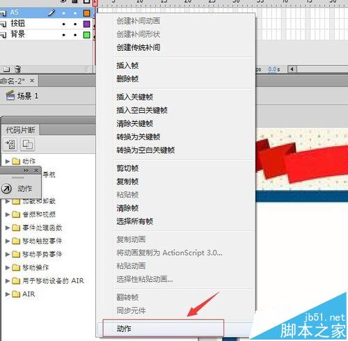 6、再AS層第一幀單擊右鍵,選擇動作,在里面就可以編寫AS代碼實現(xiàn)交互啦