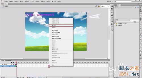 5、選中紙飛機圖層,在紙飛機的60幀處單擊右鍵,找到插入關鍵幀并點擊插入關鍵幀;然后將紙飛機圖片移動到左下角,還是將紙飛機稍微縮小一點,扁平一點。