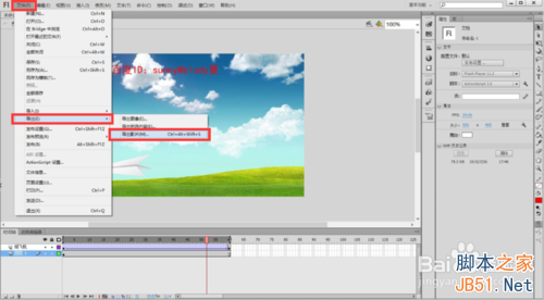 3、選擇菜單欄中的文件—導入—導入到舞臺,導入我們的紙飛機圖片,如下圖所以,用鼠標將其移道右上角的位置,適當變形一下。