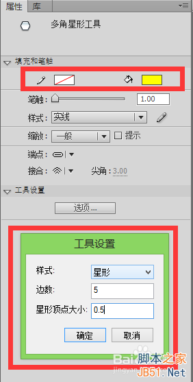3、選擇菜單欄中的插入—新建原件,名稱就叫star,類型選擇影片剪輯,點擊確定。選擇多角星形工具,選擇工具設置中的選項,設置樣式為星形,邊數為5,星形頂點大小為0.50,點擊確定,再將顏色設置為黃色。在畫布中任意畫一個五角星,并選擇移動工具移到中心一點的位置,點擊任意變形工具,并選中星星。