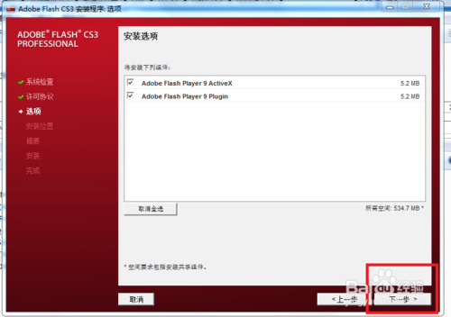安裝Flash CS3時有些組件不需要的大家可以在安裝時點不選。