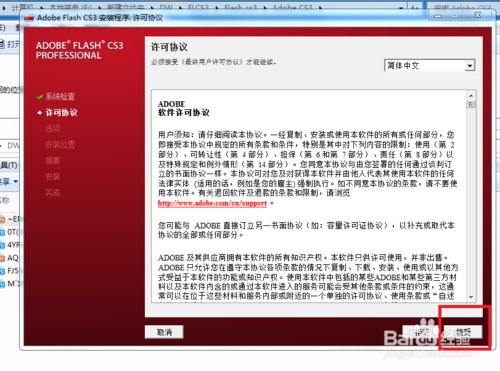 3、然后會跳出Flash CS3安裝程序-許可協議窗口,這時候點“接受”