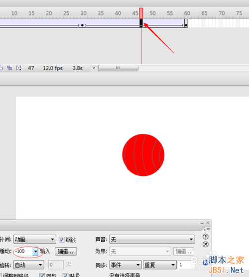 第六步,單擊30-60幀處的補(bǔ)間,同樣在下方的緩動(dòng)的數(shù)值調(diào)到-100,這是越來越快的效果,加上音效就變得生動(dòng)了起來,如果能做出球的滾動(dòng)效果就更好了。