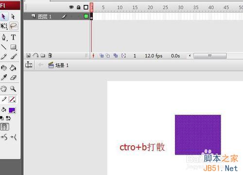 首先選中時間軸第一幀——按矩形工具在舞臺上制作一個矩形圖案——記得去掉線條工具,因為線條是不會隨填充變形的,影響美觀,把矩形打散。