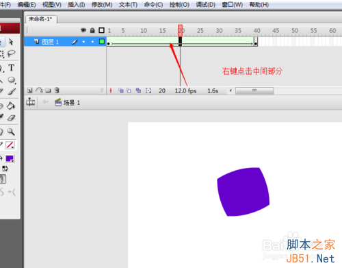 在時間軸中間用右鍵點擊鼠標插入形狀補間,不是動畫補間哦。
