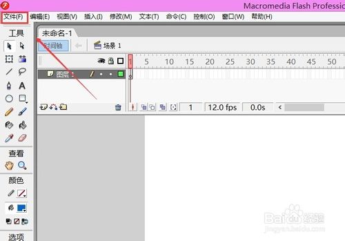 2、在新建的flash文檔里,點擊flash右上角的文件選項,如下圖所示。
