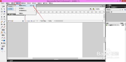 5、將圖片導入到庫后,點擊flash菜單欄上的插入,然后點擊創建元件。或者按下快捷鍵Ctrl+F8,如下圖所示。