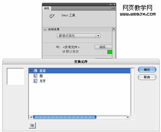 (6)選擇“ Deco工具”,按Ctrl+F3打開“屬性”面板,點擊“葉”選項中的“編輯”按鈕彈出“交換元件”對話框,選取“星星”,如圖1-5所示。