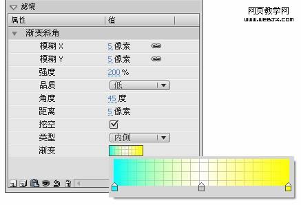 (10)選中“連接線”在“屬性”面板中添加“漸變斜角”濾鏡,漸變色為“青色”和“黃色”參數如圖1-9所示。
