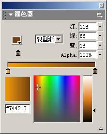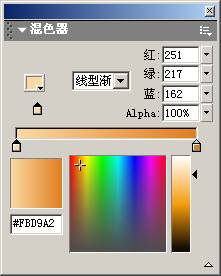 4.打開混色器面板,在填充樣式下拉列表中選擇填充類型為線型漸變,然后分別設置漸變為從淺黃色(顏色RGB代碼為251,217,162)到深黃色(顏色RGB代碼為224,126,31)的漸變,如圖3所示;