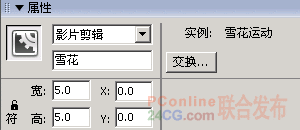 5.回到“場景1”,把庫中的“雪花運動”元件拖入到場景中,點選第3幀按下F5鍵插入幀。點選場景中的“雪花運動”元件,在“屬性”面板里給影片剪輯“雪花影片”取個實例名“雪花”,如圖4所示。