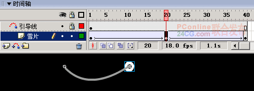4.右鍵單擊“雪片”層,在彈出的菜單中選擇“添加引導層”命令為“雪片”層建立一個引導層,如圖2所示。在引導層里畫一條曲線,將第1和第40幀的“雪片”元件吸附在曲線的左端,第20幀的“雪片”元件吸附在曲線的右端。如圖3所示(此圖為400%顯示