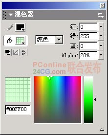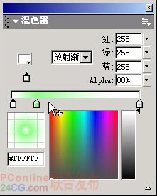 2.按快捷鍵Shift+F9打開“混色器”面板,如圖2所示進行設置。其中,3個滑塊的顏色分別是(從左至右)#FFFFFF、#54FF4B、#FFFFFF。Alpha值分別為80%、70%和0%。當鼠標變成圖2所示的樣子時,單擊左鍵就可以添加一個滑塊。按住滑塊拖出面板,再松開鼠標左鍵,即可刪除滑塊。
