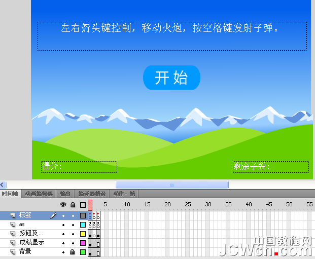 2、成績顯示層:"得分:" 動態(tài)文本:實(shí)例名 showScore "剩余子彈:" 動態(tài)文本:實(shí)例名 showShots。