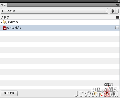 3、把AirRaid.fla文件復(fù)制到項目文件夾下(省去制作界面)。點(diǎn)擊下面的"創(chuàng)建類"圖標(biāo),在彈出的創(chuàng)建類面板類:的文本框中填入文件名:AirRaid 單擊創(chuàng)建類按鈕。這樣類就創(chuàng)建好了并為我們寫好了類的框架,我們可以在框架中添加我們的代碼了。圖:創(chuàng)建類