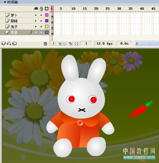 本例教朋友用Flash制作鼠標(biāo)跟隨效果。用鼠標(biāo)拖動(dòng)蘿卜,兔兔眼睛總盯住蘿卜,很可愛(ài)噢...