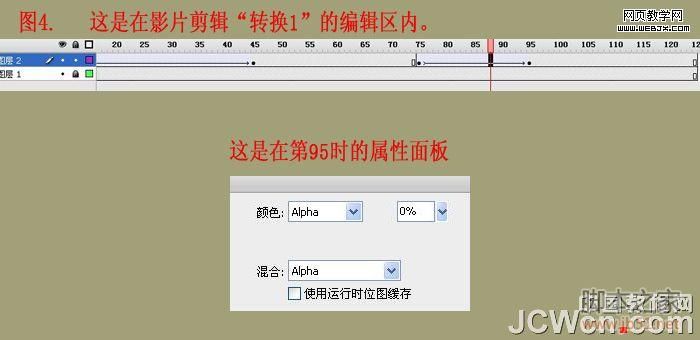 在第45幀處插入關鍵幀,用左方向鍵將它向左移至和圖片的右邊對齊,兩幀之間創建動畫補間。再回到第一幀上,在屬性面板里的“混合”模式里選擇“Alpha",第45幀上“混合”模式也是“Alpha”。繼續在第75幀上插入關鍵幀,在第95幀上插入關鍵幀,將兩幀上的圖層混合模式都改為“Alpha",選中第95幀,將屬性面板里的“顏色”模式定為“Alpha、0%”,兩幀之間再創建動畫補間。延長至125幀。回場景。如圖4: