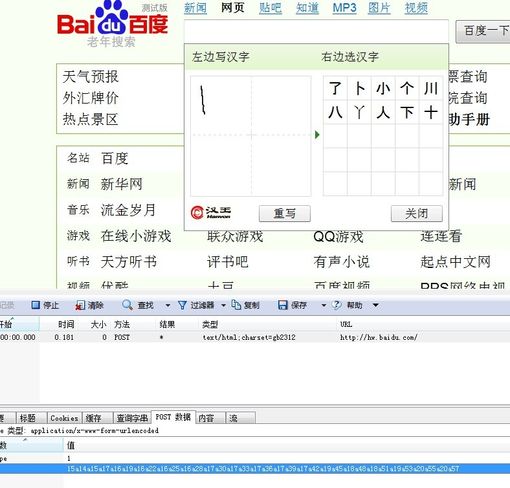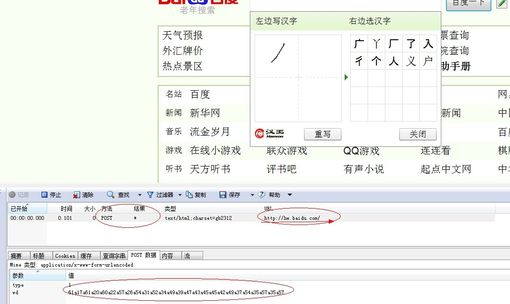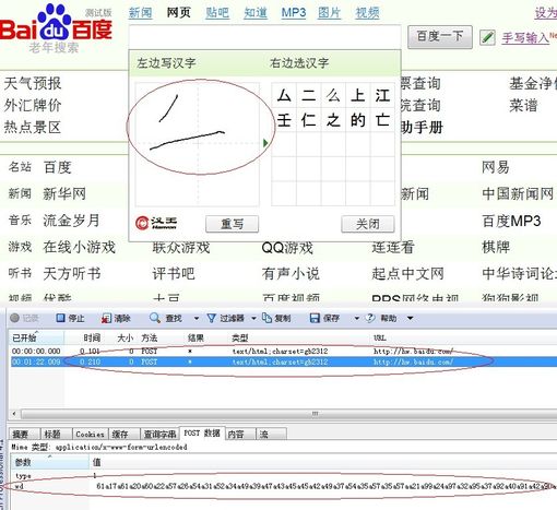 因為我之前就分析了,flash是做表現層的,底層的肯定不是由flash來弄的,所以注定了它是有數據讀寫的,所以在好奇之心的驅動下,我開啟了我瀏覽器中的HttpWatch,然后就試著隨便寫寫,發現了swf真的post了數據給一個地址http://hw.baidu.com/ ,大家可以打開這個鏈接看看,網頁里就是 {"s":"","t":3}這幾個內容,貌似和我們的手寫數據沒有任何關聯,其實不是這樣的,因為我們單獨打開是沒有傳入任何參數進去的,所以給人錯覺了
